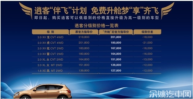 作为东风日产在城市SUV市场的另一把尖刀,逍客启动了“伴飞计划”,加上新势代奇骏,形成了“双子星”的无间配合。据悉,“伴飞计划”将从三个方面具体体现——配置升舱,越级享受:免费升级比所购车型更高一级别配置;金融升级,提前享受:零月供、零利率,即可零负担畅享逍客生活;来店有礼,超值享受:到店有更多惊喜。这三大方面为消费者带来超越1.6万元的价值升级。凡是在东风日产全国各专营店购买逍客的消费者,均可获得这三大价值回馈。