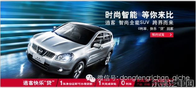 逍客——时尚智能。逍客快乐“贷”,1张身份证即可办理贷款,1天完成审批,0利率。