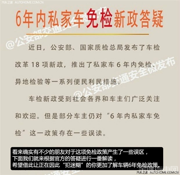 随着公安部于今年5月份颁布了新的车检政策,让广大非营运车主头疼不已的车辆年检终于有了新的转机,新政策中最大的亮点就是今年9月1日之后购买的新车将可以享受6年“免检”政策,但实际情况却是,有不少的朋友对于这项政策并不是十分清楚,而且还产生了很多误解,为此,公安部于近日发布了针对年检新政的详细解读,一起来看看详细的内容。
