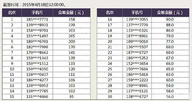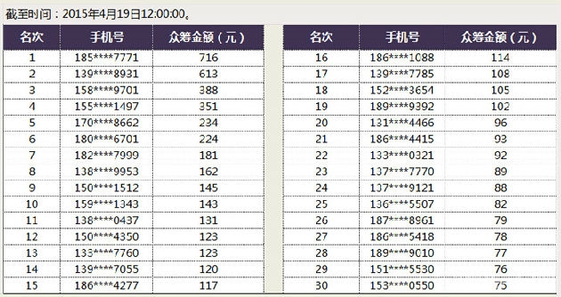 哈弗SUV品牌4月15日发起的“众筹哈弗H6Coupe,赢10年使用权”活动,得到了网友的热烈欢迎和大量转发。截至4月20日12:00,众筹活动排名首位的网友已得到1265人的支持,第二名也得到957人的支持,第三名以786位支持者的成绩紧随其后。活动前30名排名情况请见下表。
