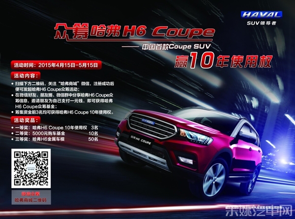4月15日,主题为“众筹哈弗H6Coupe,赢10年使用权”的活动在”哈弗商城”官微正式启动,网友只需在“微信朋友圈”中分享哈弗H6Coupe众筹信息,邀请亲朋好友为自己支付一元钱,即可获得哈弗H6Coupe众筹基金。活动结束后筹集资金最高的前三名网友,可赢得哈弗H6Coupe 10年使用权。