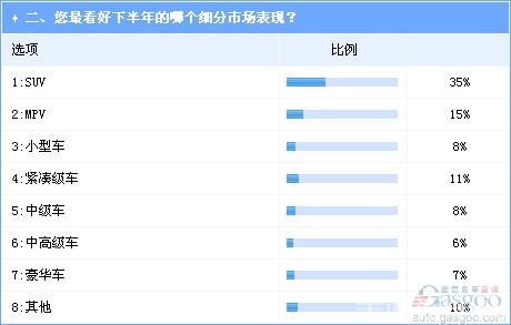 调查2聚焦各细分市场的具体表现,结果表明SUV依旧是最受关注也是最被看好的细分市场,35%的参与者认为下半年SUV市场仍将有上佳表现。MPV以15%的支持率排名第二,之后是紧凑级车市场,获得11%的选票支持。