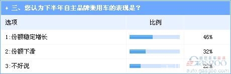 调查3对此提出设问,结果表明,多数业内人士看好下半年自主乘用车的市场表现,46%的参与者认为自主品牌份额将继续稳定提升。在SUV细分市场的布局中,长安、长城等先行者已经尝到甜头,而东风、北汽、江淮等自主车企也不甘示弱,近期凭借SUV行车的爆发式增长,市场表现也均开始回暖,如无意外,短时间内仍将维持向上的发展态势。