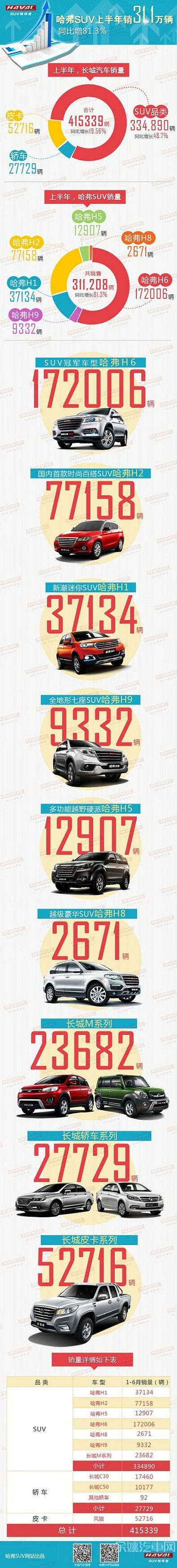 SUV冠军车型哈弗H6六月销售23458辆;国内首款时尚百搭SUV哈弗H2实现销量10010辆;新潮迷你SUV哈弗H1销售3812辆;越级豪华SUV哈弗H8销售1373辆;全地形七座SUV哈弗H9销售786辆;多功能越野硬派SUV哈弗H5销售1850辆。