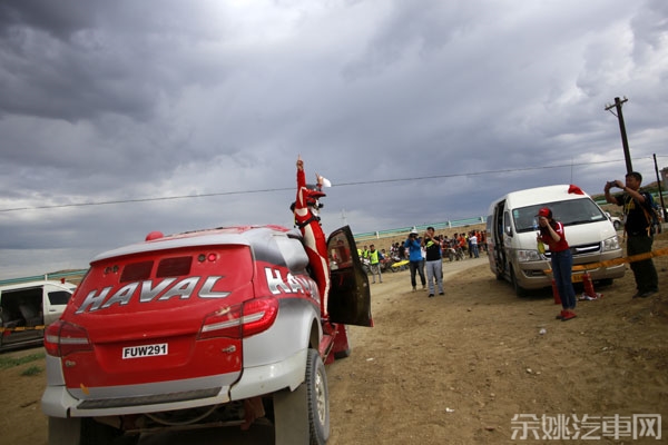随着摩托车组选手的陆续抵达,远处也出现了汽车的烟尘。“是红色”,等待在终点的人群中有人高呼,“哈弗”。第一个发车,第一个到达,韩魏和潘宏宇的104号车组上演着熟悉的模式。赛车一过终点,就被等待的人群所包围,来自各个媒体的记者也纷纷拿出长枪短炮对准了新晋的冠军车组。