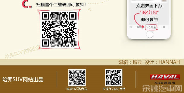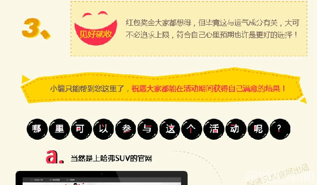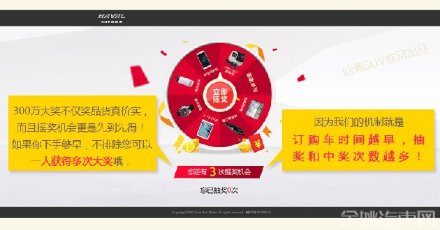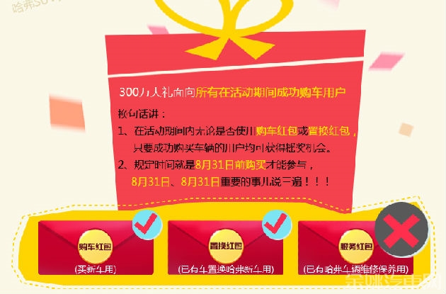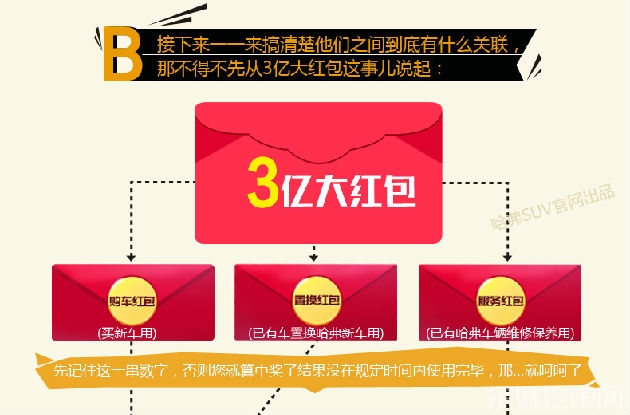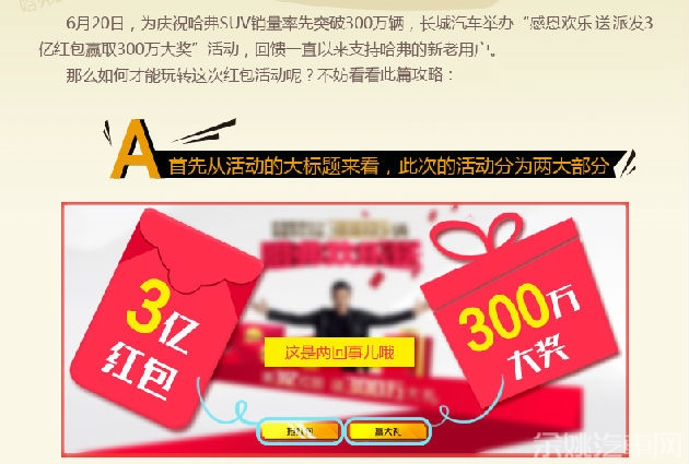 6月20日,为庆祝哈弗SUV销量率先突破300万辆,长城汽车举办了“感恩欢乐送 派3亿红包赢取300万大奖活动” 回馈一直以来支持哈弗的新老客户,那么如何才能玩转这次红包活动呢?不妨看看此篇攻略吧。