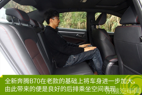 新奔腾B70的车身尺寸相较老款车型进一步加大,这不仅使车身看起来更加大气,也提高了车内的乘坐空间。身高185cm的乘客坐在前排,头部空间有一拳左右的距离,后排乘坐的话会稍显拥挤,头部和腿部大概有三指左右的余量。